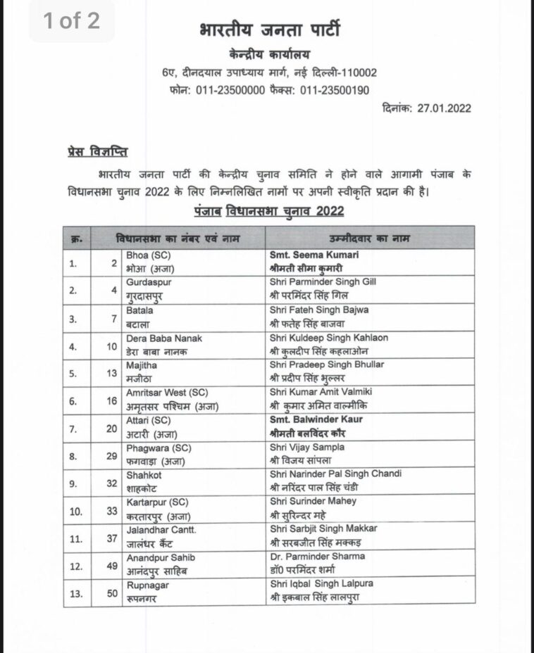 ਭਾਜਪਾ ਨੇ ਪੰਜਾਬ ਵਿਧਾਨ ਸਭਾ ਚੋਣਾਂ 2022 ਲਈ ਲਿਸਟ ਜਾਰੀ ਕੀਤੀ ਹੈ ਜਿਸ ਵਿੱਚ 27 ਉਮੀਦਵਾਰਾਂ ਦੇ ਨਾਮ ਸਾਹਮਣੇ ਲਿਆਂਦੇ ਗਏ ਹਨ। ਭਾਜਪਾ ਵੱਲੋਂ ਜਾਰੀ ਕੀਤੀ ਦੂਜੀ ਲਿਸਟ ਵਿੱਚ ਹਰਜੀਤ ਗਰੇਵਾਲ ਦਾ ਨਾਮ ਨਹੀਂ ਹੈ, ਇਸਦਾ ਮਤਲਬ ਇਹ ਹੈ ਕਿ ਇਸ ਵਾਰ ਹਰਜੀਤ ਗਰੇਵਾਲ ਭਾਜਪਾ ਲਈ ਚੋਣ ਨਹੀਂ ਲੜਨਗੇ। ਕਾਂਗਰਸ ਤੋਂ ਮੋਗਾ ਸੀਟ ਛੱਡਕੇ ਭਾਜਪਾ ਵਿੱਚ ਸ਼ਾਮਲ ਹੋਏ ਡਾਕਟਰ ਹਰਜੋਤ ਕਮਲ ਨੂੰ ਭਾਜਪਾ ਨੇ ਆਪਣਾ ਉਮੀਦਵਾਰ ਮੋਗਾ ਤੋਂ ਹੀ ਐਲਾਨ ਦਿੱਤਾ ਹੈ। ਬਟਾਲਾ ਤੋਂ ਫ਼ਤਹਿ ਜੰਗ ਬਾਜਵਾ ਨੂੰ ਟਿਕਟ ਦਿੱਤੀ ਗਈ ਹੈ ਅਤੇ ਵਿਜੇ ਸਾਂਪਲਾ ਦਾ ਨਾਮ ਵੀ ਸ਼ਾਮਲ ਹੈ। ਕੀ ਹੈ ਪੂਰੀ ਲਿਸਟ ਆਓ ਇੱਕ ਨਜ਼ਰ ਮਾਰੀਏ…