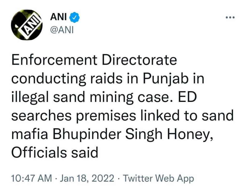 ਚਰਨਜੀਤ ਸਿੰਘ ਚੰਨੀ ਨੇ ਰਿਸ਼ਤੇਦਾਰਾਂ ਦੇ ਘਰ ਸਮੇਤ ਕੁੱਲ 12 ਥਾਵਾਂ ‘ਤੇ ED ਵੱਲੋਂ ਰੇਡ ਮਾਰੀ ਜਾ ਰਹੀ ਹੈ ਅਤੇ ਇਹ ਰੇਡ ਨਜਾਇਜ਼ ਖਣਨ, ਰੇਤ ਮਾਫ਼ੀਆ ਬਾਰੇ ਕੀਤੀ ਜਾ ਰਹੀ ਹੈ। ਇਸ ਸਭ ਵਿੱਚ ਇੱਕ ਨਾਮ ਸਾਹਮਣੇ ਆਇਆ ਹੈ ਜੋ ਕਿ ਭੁਪਿੰਦਰ ਸਿੰਘ ਦੱਸਿਆ ਜਾ ਰਿਹਾ ਹੈ ਅਤੇ ਉਹ ਚਰਨਜੀਤ ਸਿੰਘ ਚੰਨੀ ਦਾ ਭਤੀਜਾ ਵੀ ਹੈ। ਵੋਟਾਂ ਤੋਂ ਬਿਲਕੁਲ ਨਜ਼ਦੀਕ ਆਕੇ ਇਹ ਰੇਡ ਮਾਰੀ ਜਾ ਰਹੀ ਹੈ ਜਿਸਦਾ ਸਿੱਧਾ ਅੰਦਾਜ਼ਾ ਇਹੀ ਲੱਗ ਰਿਹਾ ਹੈ ਕਿ ਇਸ ਰੇਡ ਨਾਲ ਕਾਂਗਰਸ ਸਮੇਤ ਚਰਨਜੀਤ ਚੰਨੀ ‘ਤੇ ਦਬਾਅ ਪਾਉਣ ਦੀ ਕੋਸ਼ਿਸ਼ ਕੀਤੀ ਜਾ ਰਹੀ ਹੈ।