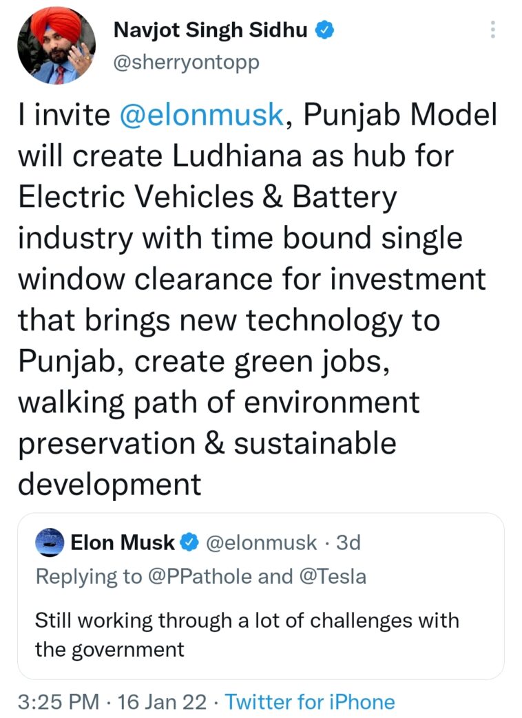 ਪੰਜਾਬ ਵਿੱਚ ਕਾਰੋਬਾਰ ਵਧਾਉਣ ਲਈ, ਨਿਵੇਸ਼ ਲਿਆਉਣ ਲਈ ਪੰਜਾਬ ਮਾਡਲ ਤਹਿਤ ਪੰਜਾਬ ਕਾਂਗਰਸ ਦੇ ਪ੍ਰਧਾਨ ਨਵਜੋਤ ਸਿੰਘ ਸਿੱਧੂ ਨੇ Elon Musk ਨੂੰ ਸੱਦਾ ਦਿੱਤਾ ਹੈl ਨਵਜੋਤ ਸਿੰਘ ਸਿੱਧੂ ਵੱਲੋਂ ਟਵੀਟ ਕਰਕੇ Elon Musk ਨੂੰ ਪੰਜਾਬ ਵਿੱਚ ਬਿਜਲੀ ਗੱਡੀਆਂ ਬਣਾਉਣ ਅਤੇ ਬੈਟਰੀਆਂ ਤਿਆਰ ਕਰਨ ਲਈ ਕਾਰੋਬਾਰ ਚਲਾਉਣ ਲਈ ਸੱਦਾ ਦਿੱਤਾ ਹੈl
