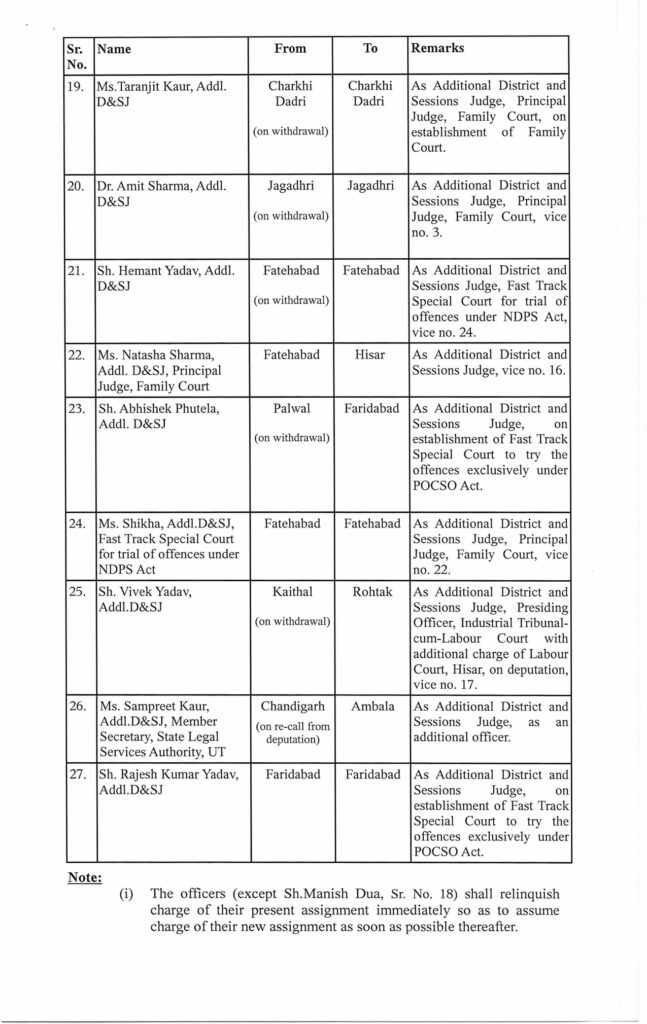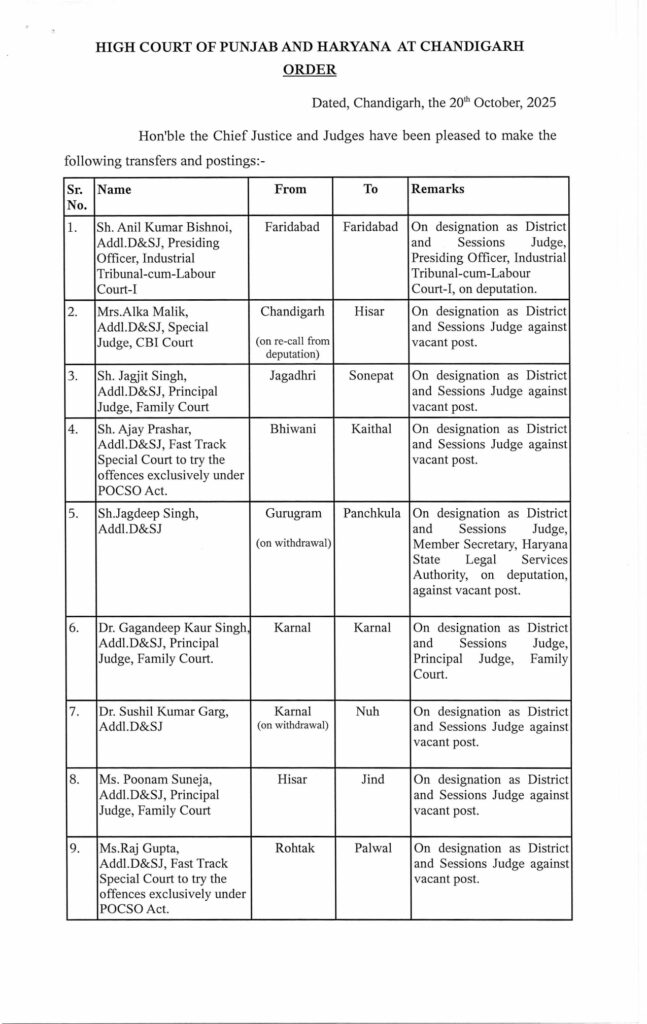 ਚੰਡੀਗੜ੍ਹ, 22 ਅਕਤੂਬਰ 2025 – ਪੰਜਾਬ ਅਤੇ ਹਰਿਆਣਾ ਹਾਈ ਕੋਰਟ ਨੇ ਹਰਿਆਣਾ ਵਿੱਚ 27 ਐਡੀਸ਼ਨਲ ਜ਼ਿਲ੍ਹਾ ਅਤੇ ਸੈਸ਼ਨ ਜੱਜਾਂ ਦੇ ਤਬਾਦਲੇ ਕੀਤੇ ਹਨ। ਇਹ ਹੁਕਮ ਸੋਮਵਾਰ ਨੂੰ ਦੀਵਾਲੀ ਦੇ ਮੌਕੇ ਜਾਰੀ ਕੀਤੇ ਗਏ ਸਨ ਅਤੇ ਤੁਰੰਤ ਲਾਗੂ ਹੋ ਗਏ ਹਨ। ਹਾਈ ਕੋਰਟ ਦੇ ਹੁਕਮਾਂ ਵਿੱਚ ਕਿਹਾ ਗਿਆ ਹੈ ਕਿ ਮਨੀਸ਼ ਦੁਆ ਨੂੰ ਛੱਡ ਕੇ ਸਾਰੇ ਅਧਿਕਾਰੀ ਤੁਰੰਤ ਆਪਣੇ ਮੌਜੂਦਾ ਕਾਰਜਭਾਰ ਛੱਡ ਕੇ ਆਪਣੀਆਂ ਨਵੀਆਂ ਡਿਊਟੀਆਂ ਸੰਭਾਲ ਲੈਣ। ਮਨੀਸ਼ ਦੁਆ ਦਾ ਤਬਾਦਲਾ ਅਤੇ ਨਿਯੁਕਤੀ 3 ਨਵੰਬਰ, 2025 ਤੋਂ ਲਾਗੂ ਹੋਵੇਗੀ।