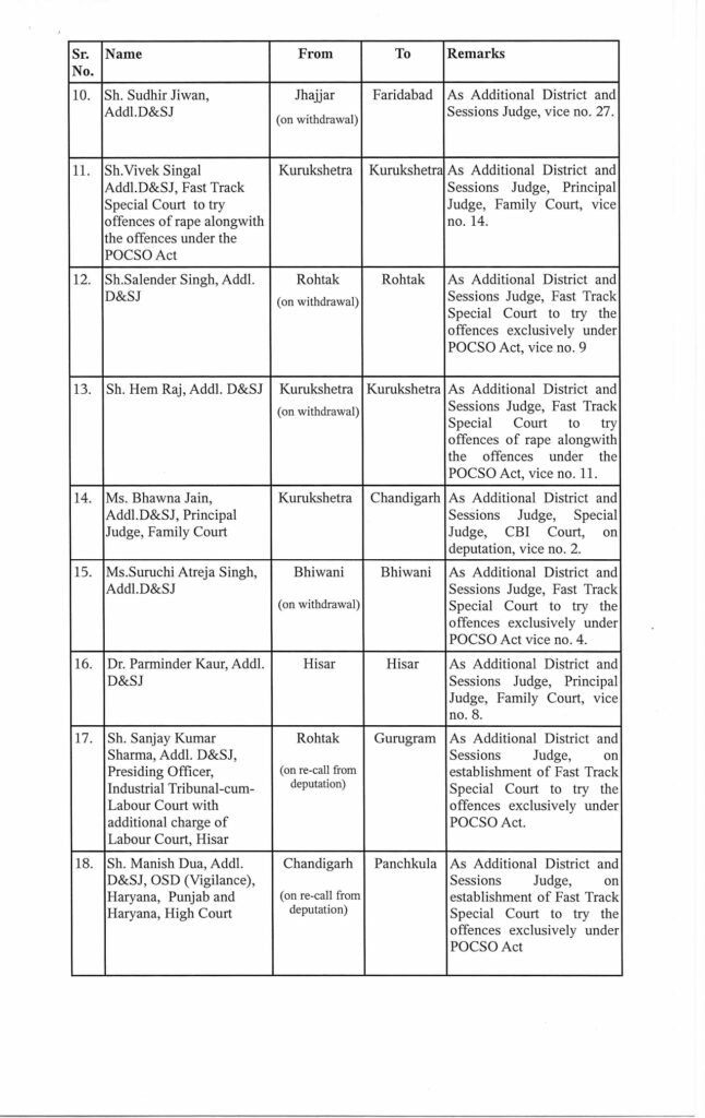 ਹਾਈ ਕੋਰਟ ਦੇ ਹੁਕਮਾਂ ਵਿੱਚ ਕਿਹਾ ਗਿਆ ਹੈ ਕਿ ਪੰਚਕੂਲਾ, ਫਰੀਦਾਬਾਦ ਅਤੇ ਗੁਰੂਗ੍ਰਾਮ ਵਿੱਚ ਫਾਸਟ-ਟਰੈਕ ਵਿਸ਼ੇਸ਼ ਅਦਾਲਤਾਂ ਸਥਾਪਤ ਕੀਤੀਆਂ ਗਈਆਂ ਹਨ, ਖਾਸ ਤੌਰ ‘ਤੇ ਪੋਕਸੋ ਐਕਟ ਤਹਿਤ ਅਪਰਾਧਾਂ ਦੀ ਸੁਣਵਾਈ ਲਈ। ਇਹ ਹੁਕਮ ਸੁਪਰੀਮ ਕੋਰਟ ਨੇ ਬਾਲ ਬਲਾਤਕਾਰ ਦੀਆਂ ਵਧਦੀਆਂ ਘਟਨਾਵਾਂ ਦਾ ਖੁਦ ਨੋਟਿਸ ਲੈਂਦਿਆਂ ਜਾਰੀ ਕੀਤਾ ਸੀ।