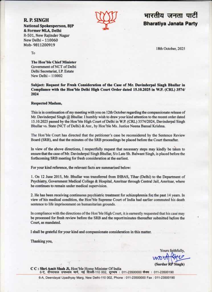 ਬੀਜੇਪੀ ਲੀਡਰ ਆਰਪੀ ਸਿੰਘ ਨੇ ਦਿੱਲੀ ਦੀ ਮੁੱਖ ਮੰਤਰੀ ਰੇਖਾ ਗੁਪਤਾ ਨੂੰ ਆਪਣੇ ਪੱਤਰ ‘ਚ ਕਿਹਾ ਕਿ, “ਇਹ 12 ਅਕਤੂਬਰ ਨੂੰ ਦਵਿੰਦਰਪਾਲ ਸਿੰਘ ਭੁੱਲਰ ਦੀ ਹਮਦਰਦੀ ਭਰੀ ਰਿਹਾਈ ਸੰਬੰਧੀ ਤੁਹਾਡੇ ਨਾਲ ਮੇਰੀ ਮੁਲਾਕਾਤ ਦੀ ਨਿਰੰਤਰਤਾ ਵਿੱਚ ਹੈ। ਮੈਂ ਤੁਹਾਡਾ ਧਿਆਨ ਦਿੱਲੀ ਹਾਈ ਕੋਰਟ ਦੁਆਰਾ 15.10.2025 ਨੂੰ ਡਬਲਯੂ.ਪੀ. (ਸੀ.ਆਰ.ਐਲ.) 3574/2024, ਦਵਿੰਦਰਪਾਲ ਸਿੰਘ ਭੁੱਲਰ ਬਨਾਮ ਰਾਜ (ਐਨ.ਸੀ.ਟੀ. ਦਿੱਲੀ) ਅਤੇ ਐਨ.ਆਰ. ਵਿੱਚ, ਮਾਣਯੋਗ ਜਸਟਿਸ ਨੀਨਾ ਬਾਂਸਲ ਕ੍ਰਿਸ਼ਨਾ ਦੁਆਰਾ ਪਾਸ ਕੀਤੇ ਗਏ ਹਾਲ ਹੀ ਦੇ ਆਦੇਸ਼ ਵੱਲ ਨਿਮਰਤਾ ਨਾਲ ਖਿੱਚਣਾ ਚਾਹੁੰਦਾ ਹਾਂ।