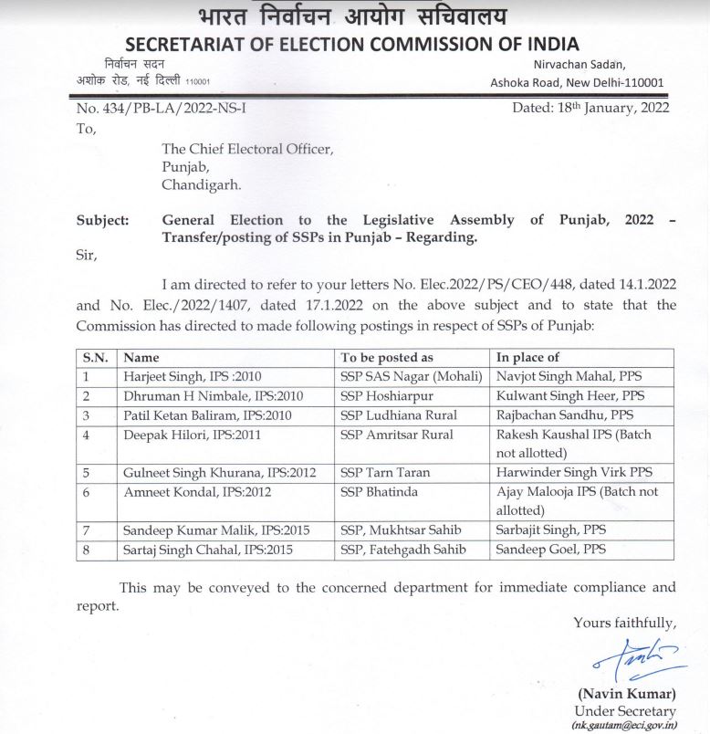 ਇਸੇ ਤਰ੍ਹਾਂ ਚੋਣ ਕਮਿਸ਼ਨ ਨੇ ਹਰਜੀਤ ਸਿੰਘ ਨੂੰ ਐਸ.ਐਸ.ਪੀ. ਐਸ.ਏ.ਐਸ ਨਗਰ, ਧਰੁਮਨ. ਐਚ ਨਿੰਬਲੇ ਨੂੰ ਐਸ.ਐਸ.ਪੀ ਹੁਸ਼ਿਆਰਪੁਰ, ਪਾਟਿਲ ਕੇਤਨ ਬਾਲੀਰਾਮ ਨੂੰ ਐਸ.ਐਸ.ਪੀ. ਲੁਧਿਆਣਾ ਦਿਹਾਤੀ, ਦੀਪਕ ਹਿਲੋਰੀ ਨੂੰ ਐਸ.ਐਸ.ਪੀ. ਅੰਮ੍ਰਿਤਸਰ ਦਿਹਾਤੀ, ਗੁਲਨੀਤ ਸਿੰਘ ਖੁਰਾਣਾ ਨੂੰ ਐਸ.ਐਸ.ਪੀ. ਤਰਨਤਾਰਨ, ਅਮਨੀਤ ਕੌਂਡਲ ਨੂੰ ਐਸ.ਐਸ.ਪੀ. ਬਠਿੰਡਾ, ਸੰਦੀਪ ਕੁਮਾਰ ਮਲਿਕ ਨੂੰ ਐਸ.ਐਸ.ਪੀ. ਸ੍ਰੀ ਮੁਕਤਸਰ ਸਾਹਿਬ ਅਤੇ ਸਰਤਾਜ ਸਿੰਘ ਚਾਹਲ ਨੂੰ ਐਸ.ਐਸ.ਪੀ. ਫਤਿਹਗੜ੍ਹ ਸਾਹਿਬ ਨਿਯੁਕਤ ਕੀਤਾ ਗਿਆ ਹੈ।