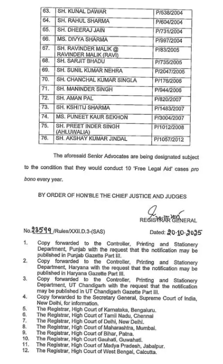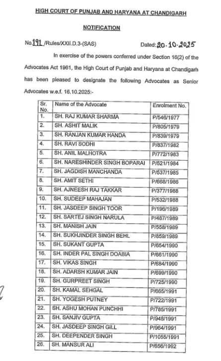 ਚੰਡੀਗੜ੍ਹ, 21 ਅਕਤੂਬਰ 2025 – ਪੰਜਾਬ ਅਤੇ ਹਰਿਆਣਾ ਹਾਈਕੋਰਟ ਨੇ 76 ਵਕੀਲਾਂ ਨੂੰ ਦੀਵਾਲੀ ਦਾ ਤੋਹਫ਼ਾ ਦਿੱਤਾ ਹੈ। ਉਨ੍ਹਾਂ ਨੂੰ ਸੀਨੀਅਰ ਵਕੀਲਾਂ ਵਜੋਂ ਤਰੱਕੀ ਦਿੱਤੀ ਗਈ ਹੈ। ਪੰਜਾਬ ਅਤੇ ਹਰਿਆਣਾ ਹਾਈ ਕੋਰਟ ਨੇ ਸੋਮਵਾਰ ਨੂੰ ਇਸ ਸੰਬੰਧੀ ਹੁਕਮ ਜਾਰੀ ਕਰ ਦਿੱਤੇ ਹਨ।