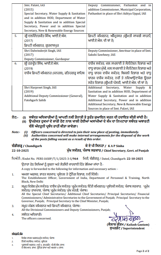 ਚੰਡੀਗੜ੍ਹ, 22 ਅਕਤੂਬਰ 2025 – ਪੰਜਾਬ ਸਰਕਾਰ ਵੱਲੋਂ 6 IAS ਅਫਸਰਾਂ ਦੀਆਂ ਬਦਲੀਆਂ ਕੀਤੀਆਂ ਗਈਆਂ ਹਨ। ਪੂਰੀ ਸੂਚੀ ਹੇਠਾਂ ਦੇਖੋ…..